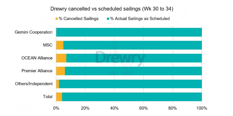 運力調(diào)整方面,盡管主要東西向航線的停航數(shù)量正在減少,7月環(huán)比下降56%,8月再降8%,但整體運力水平仍處于高位。數(shù)據(jù)顯示,在第30周至第34周(7月21日至8月24日期間)這五周內(nèi),跨太平洋、跨大西洋以及亞洲-北歐及地中海三大航線共計716個航次中,預(yù)計將有29個航次被取消,取消率為4%。其中,停航主要集中在跨太平洋東行航線(占比66%),其次是亞洲-北歐及地中海航線(21%)和跨大西洋西行航線(13%)。與此同時,未取消航次的比例正在提升,預(yù)計96%的航次將按計劃開航。
